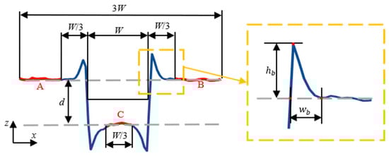 where , , and h are fitted via the least squares method to a profile. The variable δ takes the value +1 in regions A and B and the value −1 in region C. The depth of the groove d is twice the estimated value of h.