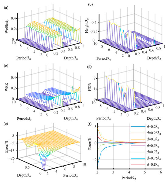 Figure 4a,b illustrate the batwing width and height values for different periods and depths of the grating. These figures also demonstrate the independence between batwing height and width. Figure 4c illustrates the dominant influence of the width-to-period ratio (WPR) on depth measurement errors, which represents the ratio between the batwing width and the grating period. When the WPR is smaller than 1/6, the impact of the batwing on depth measurement errors can be disregarded. Figure 4d shows the positive correlation between the height-to-depth ratio (HDR), which indicates the ratio between the batwing height and the grating depth, and depth measurement errors when the WPR values are similar and exceed 1/6. Figure 4e,f display the depth measurement errors of rectangular gratings with different depths and periods, assessed using the envelope evaluation method [16]. The depth measurement errors typically decrease as the grating period increases, except for certain instances near the depth values of d = 0.25 λ0 and d = 0.75 λ0. Grating depths smaller than or approximately equal to 0.25 λ0 (and also 0.75 λ0) result in negative depth measurement errors, whereas depths larger than or approximately equal to 0.25 λ0 (and also 0.75 λ0) yield positive errors [20,21,22].