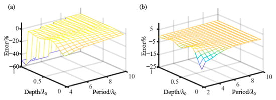 Figure 5a depicts the depth measurement errors with AN = 0.3 λ0 = 0.6 μm. As the NA decreases, the batwing width increases, leading to large measurement errors for small grating periods, especially when the depth is close to λ0. On the other hand, Figure 5b shows the depth measurement errors with AN = 0.55 = 0.5 μm. Decreasing the center wavelength leads to a reduction in the batwing width, resulting in smaller depth measurement errors for small grating periods. Moreover, we conducted simulations to examine the influence of altering the illumination spectrum and shadow factor on the depth measurement error, and we observed that these variations closely resemble the patterns depicted in Figure 4e. Therefore, we can conclude that these factors have a minimal influence on the depth measurement error, and therefore, we have not included the corresponding figures in this paper.