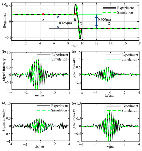 The Bruker step standard with a calibrated height of 0.4598 μm was measured using a Mirau objective with AN = 0.55 and LED light sources with λ0 = 0.6 μm and = 0.08 μm. Figure 6 presents a comparison between simulated and experimental results. In Figure 6a, the black line represents the experimental profile, and the green line represents the simulated profile. In Figure 6b–e, the black lines represent the experimental signals, and the green lines represent the simulated signals. These signals correspond to points A–D in Figure 6a, respectively. We assumed σ to be 0.5. R1 and R2 were constant and assumed to be 1.