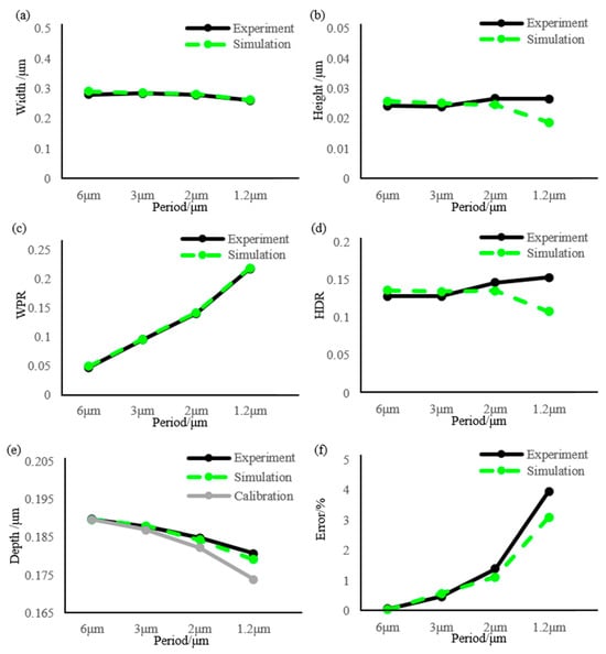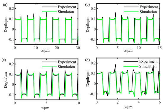 The simulated and experimental profiles in Figure 7 demonstrate strong agreement. To evaluate the similarity between these profiles, the cross-correlation function is utilized. Table 2 presents the computed cross-correlation values for Figure 7a–d, which indicate a decreasing trend as the period decreases. This relationship is further supported by Table 2 and Figure 8e, where the simulated and experimental depths, calculated using the ‘W/3 rule’ for gratings with varying periods, exhibit larger errors compared to the calibrated depth.
