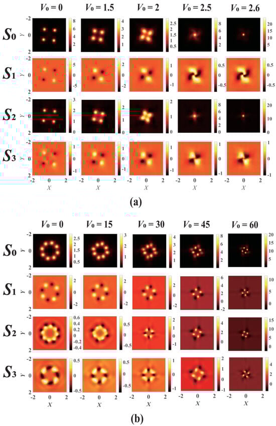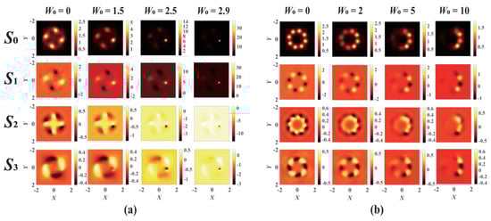 The evolution of vector vortex beams in a Kerr-SCPT medium for different gain–loss modulations is shown in Figure 4. For the case m = 1 and n = 1, when W0 (the imaginary part gain–loss modulation depth) increases, three points of the original four collapse points gradually become darker, and finally there is only one collapse point, as seen in Figure 4a. On the other hand, for m = 2 and n = 1, the beam collapses into three or four collapse points with varying intensities instead of the original eight points as W0 increases, as shown in Figure 4b. The distortion and variation in the collapse positions are attributed to the modulation of the gain–loss distribution. The asymmetric collapse is attributed to the anti-centrosymmetric gain–loss modulation of the lattice.