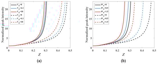 The normalized peak intensity of the VVOF in a Kerr-SCPT medium as a function of the transmission distance. m = 2, n = 1, d = 0.4, the solid line indicates Pin = 11 PG, dotted line indicates Pin = 9.1 PG. (a) W0 = 0; (b) V0 = 0.