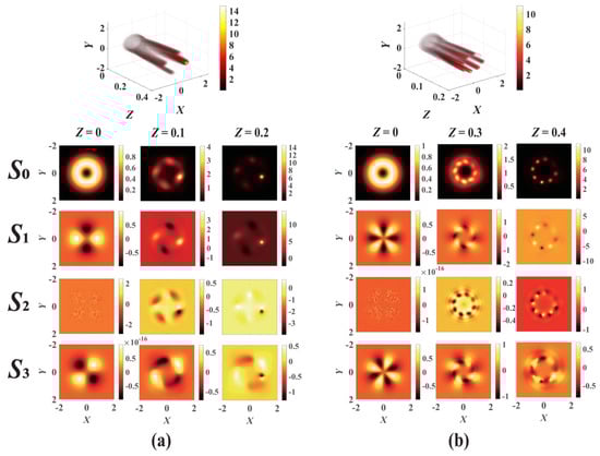 Numerical calculations with split-step finite difference are carried out to further explore the collapse dynamics of a VVOF in a PT-symmetric Kerr medium, here λ = 0.53 μm and w0 = 10 μm. The evolution of the polarization state of a VVOF in a Kerr-SCPT can be described by the Stokes parameters: S0 = |EX|2 + |EY|2, S1 = |EX|2 − |EY|2, S2 = EXEY* + EYEX*, and S3 = i(EXEY* − EYEX*), where S0 denotes the light intensity and S1 represents the linear polarization component (its positive and negative values correspond to the horizontal and vertical directions, respectively). Similarly, positive and negative S2 represent the linear polarization components in the 45° and 135° directions, respectively, and the positive and negative values of S3 denote the left and right circular polarization components, respectively.
