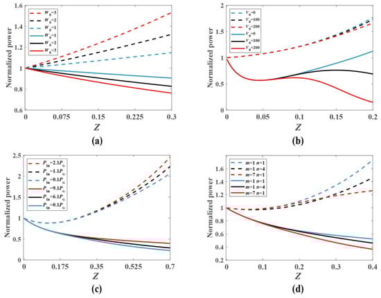 The normalized powers of the VVOF in a Kerr-SCPT medium as a function of the transmission distance with different modulating parameters W0, V0, and d and topological numbers (m, n) are shown in Figure 8. The powers have been normalized to their initial powers. The powers remain invariant if W0 = 0 because of the conservation of energy. When d = 0.25, V0 = 0, and W0 ≠ 0, the powers of the VVOF increase during propagation in a Kerr-SCPT medium, indicating that the gain effect of the VVOF is greater than the loss effect. On the contrary, if d = 0.45, V0 = 0, and W0 ≠ 0, the power of the VVOF weakens with the extension of transmission distance, indicating that the gain effect of the VVOF is less than the loss effect, as shown in Figure 8a. When V0 ≠ 0 and W0 ≠ 0, the powers of the VVOF are influenced by the refractive index modulation of V0 due to its effect on the evolution of the VVOF. The influence of V0 on the power of the VVOF depends on the relative position of the PT lattice potential. When the VVOF is subjected to more gain for the values of V0, the power of the VVOF will be enhanced. In the contrary scenario, the power of the VVOF will be weakened. As shown in Figure 8b, when d = 0.95 and W0 = 12, the power of the VVOF increases with the extension of the transmission distance. It is worth noting that with the increase in V0, the power enhancement trend of the VVOF decreases. This is because the increase in V0 changes the refractive index of the Kerr-SCPT medium and the field distribution of the VVOF, resulting in the change in the relative position of the VVOF and PT lattice potential. However, due to the complex evolution of the VVOF in the Kerr-SCPT medium, the gain–loss ratio of the VVOF may have large fluctuations, as shown in Figure 8b. Especially when the value of W0 is large, the powers are sensitively related to the variation in V0, as shown by the solid lines in Figure 8b with d = 0.45, W0 = 90, and the power curves of the VVOF show large fluctuations during propagation. In addition, the power variations are also related to the initial powers and the topological charge number (m and n), as shown in Figure 8c,d. The reason for the power changes is that the nonlinear refraction index and gain–loss are related to the initial powers, as shown in Figure 8c, whereas the distributions of the VVOF are modulated by the topological charge number (m and n), as shown in Figure 8d. Therefore, the powers of the VVOF in a Kerr-SCPT medium can be dynamically manipulated with the modulation of the gain–loss (W0), the real refractive index modulation depth (V0), initial power (Pin), and topological charge number (m and n) when W0 ≠ 0.
