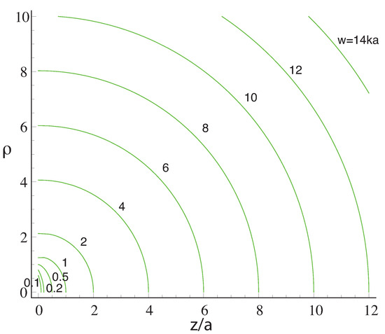 Contours of u and v are plotted against and in Figure 1 and Figure 2 for FrA1 and FrA2, respectively, where the variable , the shadow edge corresponds to , and small (small u) corresponds to the far field. Lines of constant v are straight lines in both cases. They are very similar for small values of v but become more different as v increases. Lines of constant u are straight lines for FrA1 and circles for FrA2. They agree quite well for small and larger than about three.