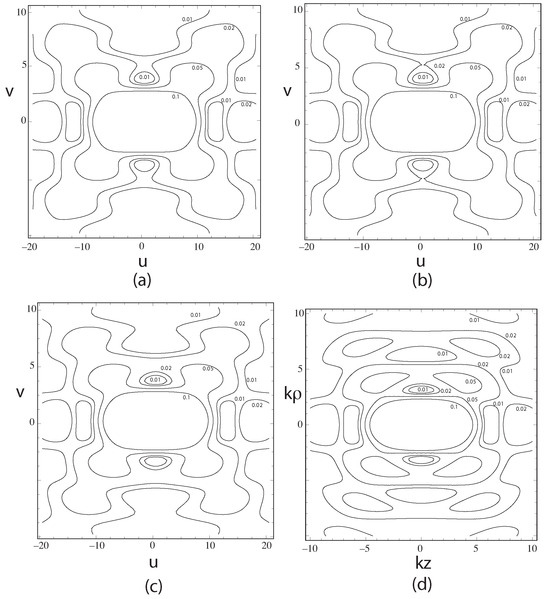 Linfoot and Wolf investigated the field near the focal region for a circular aperture (as well as for annular apertures) based on the paraxial Debye approximation, and plotted contours of constant intensity in the focal region [30]. The plot was later reproduced in Born and Wolf [14]. The corresponding optical coordinates are and , where is the semi-angular aperture and and z are cylindrical coordinates. Thus, for a contour plot of the intensity in a meridional section, contours of constant are parallel to the z and coordinates, respectively, and the intensity in the focal region is symmetrical about the focal plane, meaning that the intensity maximum is at the focal point [14].