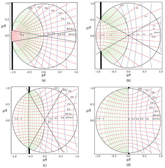 The Fresnel approximation uses a parabolic approximation of r evaluated by a power series expansion that becomes worse as increases relative to z or . This is unfortunate, as we know from the stationary phase method that the edge of the aperture makes a significant contribution to the integral. Thus, alternative ways of matching can be expected to provide an improved result [59]. In the generalized Fresnel approximation (gFrA), we still use a parabolic approximation, but choose to match up at the critical points of r in the stationary phase evaluation of the diffraction integral [64]. However, we do not actually use a stationary phase expansion, and only use it to define the optical coordinates, meaning that the approach is valid even in the focal region. Here, we have
