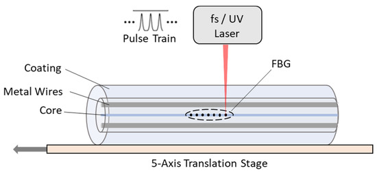 Broadband fiber Bragg gratings (FBGs) were then inscribed with a two-meter spacing between each written grating following the draw procedures, as shown schematically in Figure 1. The fiber was positioned so that the laser has an open path to the core without being obstructed by the Metglas® wires.