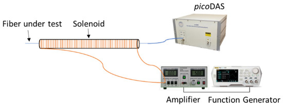The response of the sensing fibers to lateral magnetic fields was evaluated using a two-meter-long air core solenoid. The fiber was positioned so that the two inscribed FBG’s were set at each individual end of the two-meter solenoid. AC magnetic fields were generated in the solenoid with a waveform generator attached to an amplifier. A magnetic sensing probe was used to measure the AC magnetic field amplitude inside the solenoid at the same location as the fiber. The sensing fiber sample was connected to the picoDAS interrogator, as seen in Figure 5, to measure the dynamic strain in the time domain. This was performed using a standard single mode fiber (SMF) fusion splicer to mechanically align a connector (for the interrogation system) and the magnetic sensing fiber with a drop of optical fluid in between, ensuring transmission. The effective loss was checked and minimized using an optical time domain reflectometer (OTDR). The fast Fourier transform (FFT) of the strain data was then performed using a custom MATLAB script. The transform uses the input matrix of time, distance, and strain from the picoDAS interrogator, generating an output of an intensity spectrum over a range of frequencies (up to 20 kHz). The sinusoidal constituent amplitudes provide the recorded intensity.