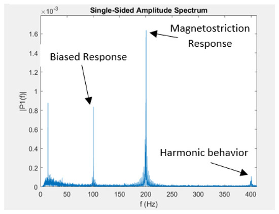 The peak at 200 Hz indicates the magnetostrictive strain response from an 11.40 μT amplitude 100 Hz applied magnetic field. This doubling occurs because of the nature of the magnetostrictive materials. The maximum strain response in a magnetostrictive material produced from a given sinusoidal magnetic field occurs at both the minimums and maximums of the sinusoidal signal. The domain alignment along the axis and the resultant strain is effectively the same regardless of whether the field is positive or negative. The strain response will thus correlate to the magnitude of the magnetic field amplitude. This creates a frequency doubling in the strain response compared to the driving frequency of the magnetic field. However, if there is any offset to the magnetic field such that the midline of the sinusoidal wave form is greater or less than zero, the magnetostrictive strain response will begin to have a driving frequency component. This is because the minimum and maximum magnitudes of the waveform are no longer equal. If the offset pushes the minimums above zero, the strain response will then only be composed of the driving frequency. Figure 6 shows a combination of 100 Hz and 200 Hz responses. While the generated waveform is originally unbiased, interference from ambient magnetic fields provides an offset, providing a peak response at both the driving frequency and the doubled variant. Peaks in the low frequency range (below 20 Hz) occur because of the noise from the testing environment. A smaller 400 Hz peak also occurs in Figure 6, resulting in an acoustic harmonic from the magnetostriction vibration. The metal wire inclusions, when undergoing magnetostriction, vibrate, creating an acoustic signal. The acoustic signal will naturally result in resultant frequencies in integer multiples from the initial vibration response in the wires.