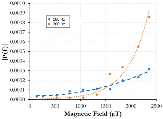 The response of the sensing fiber with one Metglas® cladding was assessed, comparing the intensities of both the driving frequency and the doubled frequency amplitudes. The sensor response upon exposure to a 100 Hz AC magnetic field was evaluated, as shown in Figure 7, looking at both 100 and 200 Hz, demonstrating a sensitivity of around 50 μT.
