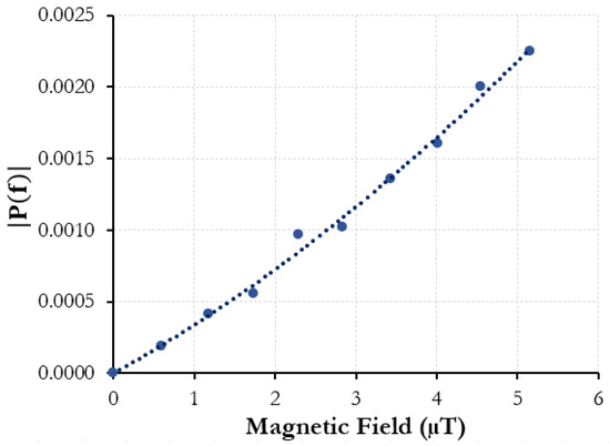 This implies that the Metglas® inside the fiber sensor is approaching the saturation of the magnetostriction. Upon increasing the AC magnetic field, the magnetic domains are allowed to move with a larger range of motion and, in turn, create a stronger signal. At the largest field measured (2358 μT), the strain response FFT intensity was almost an order of magnitude greater than that of the sample before annealing. Thus, magnetic annealing can be performed to increase the relative magnetic sensing resolution for the fiber sensor at higher field strengths, as compared to the pristine condition.