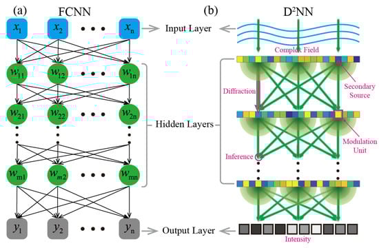 The IWFSP proposed in this paper is essentially an optical neural network optimized for wavefront sensing and processing tasks, which is a variant of the diffractive deep neural network (D2NN). Introduced by Lin et al. from the University of California, D2NN is an optical computation architecture based on the diffraction effect, enabling specific inference tasks at the speed of light [11]. The implementation process of IWFSP, like a typical D2NN, comprises two stages: electronic training and optical deployment. The electronic training stage can be seen as an automatic design process for the modulation layer of the optical field on an electronic computing platform. It is data-driven, utilizing abundant sample data to update parameters through deep learning algorithms iteratively. A comparison between the D2NN and the classical Fully Connected Neural Network (FCNN) is illustrated in Figure 1, where both consist of input, hidden, and output layers. Unlike electronic neural networks, in D2NN, the interconnection between neurons is described by optical diffraction theory, which implies that the forward propagation of this model can be regarded as a numerical simulation of spatial light modulation and diffraction for a specific complex field. Consequently, based on the free-space optical interconnection, the parameters of the neural network trained electronically correspond to the modulation coefficients of spatial light, which can be deployed to achieve optical computation for specific tasks.