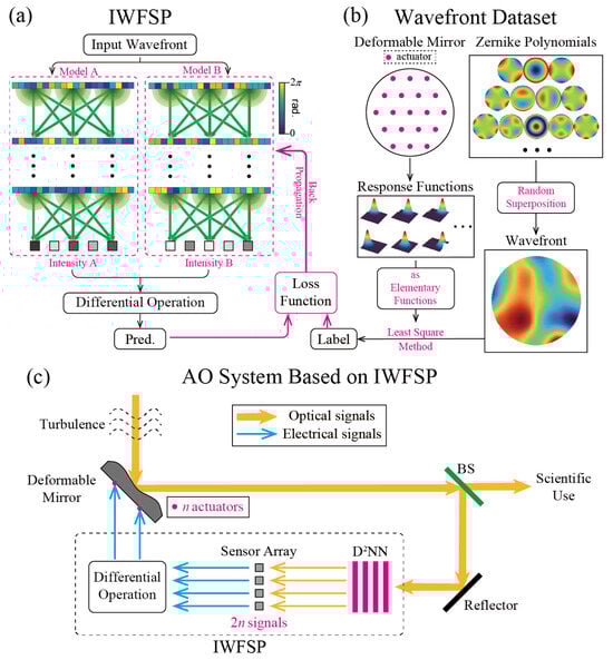 Additionally, we have specifically optimized the IWFSP for subsequent collaboration with the deformable mirrors, where output intensity signals, after simple differential operations, can be directly utilized to control actuators for correction, thereby constructing a high-bandwidth AO system, as illustrated in Figure 2c. When working, a wavefront sensor in a traditional AO system, such as the Shack–Hartmann wavefront sensor (SH-WFS), first needs to collect the intensity distribution at the focal plane of the microlens array, and then calculate the intensity center of mass within the sub-aperture, and then The local slope of the wavefront is calculated based on the offset of the center of mass from the ideal focus, and finally the wavefront is reconstructed based on the slope of the wavefront. Then, the wavefront processor computes actuator control signals based on the reconstructed wavefront and the optical response function of the deformable mirror, involving extensive and complex matrix operations. Then, the wavefront processor needs to calculate the control signals of actuators based on the reconstructed wavefront and the optical response function of the deformable mirror, which involves a large number of complex matrix operations. In contrast, the proposed IWFSP method accomplishes most of the computations during wavefront sensing and processing using optical neural networks, resulting in minimal data volume for subsequent electronic operations. For a deformable mirror with n actuators, only intensity signals need to be detected and subjected to simple differential operations, significantly reducing the time required for wavefront sensing and computation processes.