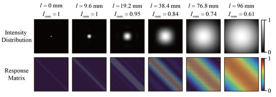Furthermore, we validated this through numerical simulations of the diffractive response matrix at different distances. As mentioned earlier, the diffraction propagation phenomenon of light can be regarded as a linear system. For a diffractive layer containing neurons, it has inputs and outputs. By applying unit excitation to each neuron and observing output intensities at different distances, we obtained multiple diffractive response matrices of size , as depicted in Figure 3. It is important to note that both the intensity distribution and the response matrices in the figure have been normalized. It can be observed that with increasing distance, the response of edge neurons becomes more pronounced. However, the total intensity decreases because some of the light propagates outside the calculation window. This implies the necessity of selecting an appropriate inter-layer spacing l to maintain a high utilization of light intensity while satisfying the fully connected characteristic of the diffraction neural network. Consequently, in this study, we chose an inter-layer spacing of cm.