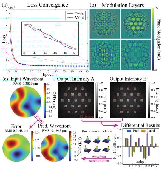 Parameters of the trained IWFSP model are extracted and transformed to obtain the final optimized design for the cascaded phase modulation layers, as shown in Figure 4b. After training with a large dataset, the model forms specific modulations at positions corresponding to the peak values of the response functions, establishing a connection between the input wavefront’s local information and the target region’s light intensity. From the wavefront sensing and reconstruction process of a random sample in Figure 4c, it is evident that after optical computing through phase modulation layers, the model provides two sets of discrete light intensity distributions on the output plane. Assuming subsequent collaboration of IWFSP with a deformable mirror containing n actuators, models A and B will, respectively, output n discrete output light intensities, denoted as and . The final prediction value of IWFSP is determined by the following differential operation:
