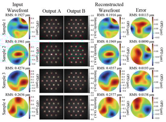 After obtaining the predicted values, we can multiply them with the corresponding elementary function and then superimpose sum them up to obtain the final reconstructed wavefront. The wavefront sensing results of four random test data not used during the training process are shown in Figure 5, indicating its ability to generalize to a certain extent. We then conducted traversal verification on the test set of 2000 samples and calculated that the input wavefront’s average Root Mean Square (RMS) value was 0.2849 μm. The average RMS of sensing error was 0.0167 μm, which accounts for only 5.86% of the input wavefront RMS. Therefore, it can be concluded that IWFSP has high-precision sensing performance, which is comparable to traditional wavefront detection methods.