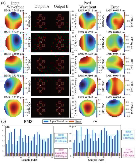 Experimental results of the optical implementation of the IWFSP model. (a) Experimental results for five random wavefront samples. (b) PV and RMS of all thirty wavefront samples and wavefront residuals.