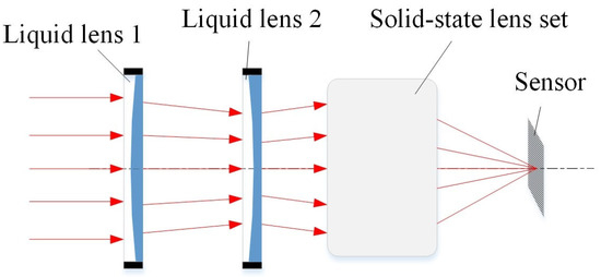 The designed monocular vision system consists of two liquid lenses, a solid-state lens set, and a sensor, as shown in Figure 1. Among them, liquid lens 1 is mainly adopted to compensate for image plane offset, which is equivalent to the compensation unit. Liquid lens 2 is mainly adopted to change the focal length of the system, which is equivalent to the variable magnification unit. The solid-state lens set plays a role in maintaining focal power and correcting aberrations.