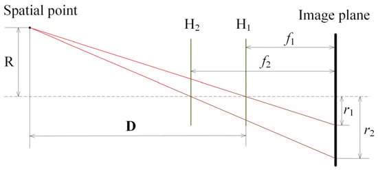 According to geometric optics, there is a quantitative relationship between the depth of spatial objects and the image vector length, as well as the corresponding focal length. Therefore, by searching for matching point pairs in two zoom images, the image vector length can be obtained. On the basis of solving the corresponding focal length, the depth information of the spatial objects can be calculated. By simplifying the monocular vision system into a pinhole model, the imaging geometric models of the system in small focal length f1 and large focal length f2 states can be obtained, as shown in Figure 2.