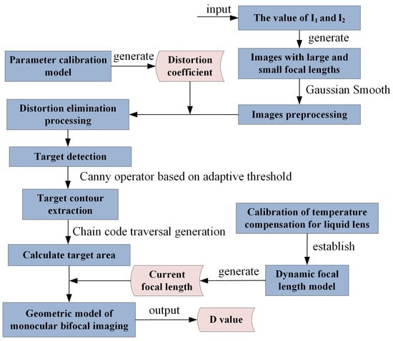 Based on the above parts, a monocular depth sensing method based on liquid zoom imaging is formed, and its algorithm flow is shown in Figure 3. Firstly, by adjusting the input currents I1 and I2 of the two liquid lenses, the system can quickly perform zoom imaging on targets, resulting in two images with wide and narrow fields of view. Then, the image is preprocessed by Gaussian smoothing. According to the distortion coefficient obtained by the system calibration, the object image is processed to eliminate the distortion, and the object contour is extracted by Canny operator based on an adaptive threshold. Furthermore, the area of target images corresponding to wide and narrow fields of view is generated by the calculation method, which is based on chain code classification and strip segmentation. Finally, the dynamic focal length model is adopted to obtain the current focal length of the system, and the target depth D is calculated by combining the monocular bifocal imaging geometric model.