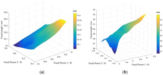 Since liquid lens 1 is used for image focusing, the variation of its focal power is affected by both temperature and object distance. However, liquid lens 2 mainly plays a role in changing the focal length of the system, and its focal power change is usually only affected by temperature, so the fluctuation range of the focal power of liquid lens 2 is smaller than the former. Twenty-five groups of data were collected respectively in the preset current neighborhood corresponding to the wide and narrow field of view. According to the data of input current and temperature, the equivalent current and focal power of two liquid lenses were obtained by Equation (6). According to the focal length model solution method in Section 2.3.2, the focal length functions of the system in wide and narrow fields of view can be obtained, as shown in Figure 6.
