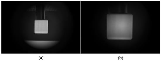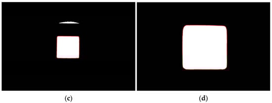 The image vector lengths r1 and r2 in Figure 2 are calculated starting from the principal point position of the zoom system. However, the liquid optical zoom system is affected by the gravity of the liquid [], and there is a degree of optical axis drift phenomenon, which may cause the principal point coordinates to shift during the zoom process. To eliminate the influence of principal point offset on depth measurement accuracy, this paper uses the target area instead of the image vector length as the feature for depth calculation. The ratio of the image vector length can be expressed as:
