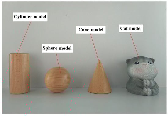 In order to verify the generalization ability of the measurement method, four objects with different shapes (cylinder model, sphere model, cone model, and cat model), as shown in Figure 8, were selected as test objects. The profile section of the measured object was taken as the depth measurement position, and the target distance was set to 500 mm. The liquid vision system was adopted for zoom imaging and image processing, and the depth measurement results were generated based on the proposed algorithm.