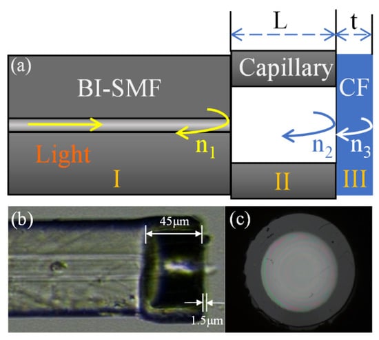 A schematic diagram and optical microscope images of the diaphragm-based optofluidic flowmeter are shown in Figure 1. The sensor consists of a bend-insensitive single-mode fiber (BI-SMF), a standard fused-silica capillary, and a coreless fiber (CF). Compared to a single-mode fiber (SMF), the coreless fiber has more uniform distribution of silicon oxide without germanium doping, which can ensure a uniform reduction in the monoblock diaphragm during the polishing and etching processes. Primarily, a part of the fused-silica capillary with an inner diameter of 100 µm was fusion spliced with a bend-insensitive single-mode fiber with a core diameter of 8.9 µm. The outer diameter of the fused-silica capillary tube is 140 µm, which is larger than that of BI-SMF. Thus, instead of a commercial fusion splicer, a computer-controlled CO2 laser system was used for fusion splicing. In the second step, to ensure the flatness of the capillary end face and the accuracy of the remaining capillary length, a multifunctional femtosecond laser platform was applied to cut off the capillary with a 50× microscope []. Similarly, following the previous two steps, a fraction of the coreless fiber was fusion spliced with the remaining capillary, and the pigtail was cut off. Meanwhile, the FPI structure of an air cavity was constituted, and the coreless fiber was regarded as the end of FPI. In order to acquire a thin film of FPI, a self-developed fiber polishing machine was employed to reduce the diaphragm thickness. While the diaphragm thickness was gradually decreased to less than 3 µm by precise control and optimization of the polish parameters based on speed, pressure, and time, distinct concentric rings appeared, which are the interference fringes of the inner and outer membrane surfaces under illumination. As exhibited in Figure 1c, the air gap is not uniform, but it will not significantly affect the reading and repeatability based on the measurement results. In the future, the quality of the air gap will be improved through low-power fusion splicing with rotating fibers. Then, through buffered hydrofluoric acid (BHF) etching, a thinner silica diaphragm can be formed [].