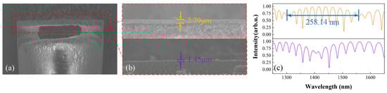 where λn is the dip wavelength of the spectral envelope. Using Equation (2) in Figure 2c, the length of the spectral envelope is 258.14 nm, and the silica diaphragm thickness is shown to be 2.71 μm. As shown in Figure 2b, the corresponding diaphragm thickness in the SEM diagram is 2.79 μm in accordance with the spectral calculation.