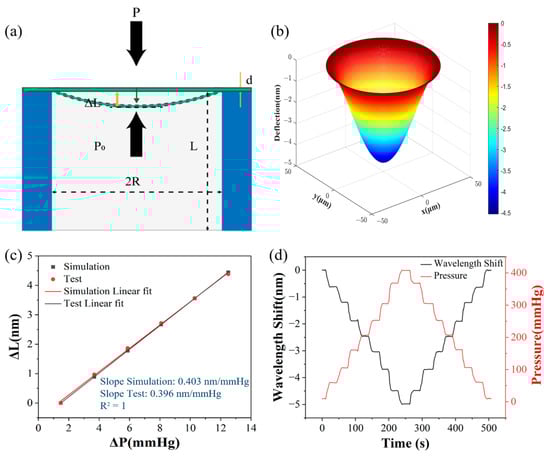In the case of the deformation of the thin diaphragm, which does not exceed 30% of its thickness, the deformation of the fused silica diaphragm is linearly related to the external pressure. It is assumed that the limit of the sensing film thickness is about 1.5 μm, and the corresponding maximum deformation is less than 450 nm. The relationship between the different pressure and the cavity length change is presented in Figure 3c. Similar to the method of determining the diaphragm thickness, the cavity length can be calculated by estimating the period of small envelopes in the reflection spectrum. It can be seen that the theoretical sensitivity of the proposed sensor is calculated as 0.403 nm/mmHg, which matches the sensitivity obtained from testing (0.396 nm/mmHg). The detectable pressure range is calculated to be 0∼1136 mmHg and can allow this flow pressure range in medical catheter testing.