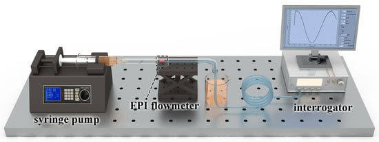 The fiber Fabry–Perot interferometer (FFPI) is an appropriate sensor, which has been widely developed to measure blood pressure [], displacement [], temperature [], liquid surface tension [], acoustic vibration [], refractive index [], and hydrogen detection [] in the physical and biochemical research fields. Presently, some researchers pay attention to flow-field sensing to extend the application fields of the fiber-optic FPI sensors []. To achieve a precise flow rate signal directly, some FP-based mechanical flow sensors consisting of moving structures are made, such as a cantilever, spring, and diaphragm, which are essentially sensitive to pressure. C. Wang et al. embedded fiber-optical anemometers based on dual F-P sensors inside a designed cubic holder by 3D printing, with a streamlined upper surface, and proved an airflow velocity measurement range from 20.39 m3/h to 209.03 m3/h []. Y. Liu et al. proposed a differential-pressure optical-fiber anemometer based on Fabry–Perot interferometry coupled with a Pitot tube for air flow velocity measurements over a range of 737.28∼43,956.66 m3/h in a wind tunnel []. Nevertheless, the complexity of real-time liquid flow detection has not been determined, limited by sensor size in the pipeline microchannel. To ensure the stability of the flow field, the size of implantable flowmeters is no more than one-tenth of the pipe inner diameter []. The aforementioned FPI flow sensors are both millimeter size, and it is worth noting that FPI flowmeters in the hundreds of microns range are rarely mentioned. In addition, fiber-optic FPI sensors manufactured using the adhesive process have poor stability, possibly due to water penetration. Moreover, the flow rates measured by FPI flowmeters under variable temperature can be hugely problematic for signal decoupling.