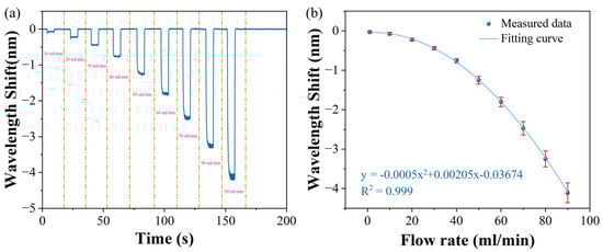 The wavelength shift detected by the FPI flowmeter at flow rates from 0 to 90 mL/min was captured, and the standard deviation of the time-series signal was calculated. As plotted in Figure 6b, the change in the dip wavelength is quadratically proportional to the flow rates, and the standard deviation is increased when the flow rate is increased because a greater flow rate results in greater fluctuation in the sensor film. Before the fluid flow-rate measurement, the pipeline was filled with deionized water, and the dip wavelength was recorded as a reference wavelength, which is 1563.48227 nm at a flow rate of zero. In the experiment, flow detection over a large range was obtained with the highest sensitivity of 87.95 pm/mL/min, and the flow rate resolution was determined by the standard deviation (SD) of 250 repeated measurements at each point, obeying the SD of 1.08 mL/min, which is 1.2% of the full scale (F.S., 0∼90 mL/min). It is worth noting that that by improving the sensitivity of the FPI flowmeter, flow rates in the range of tens of µL/min can be achieved.