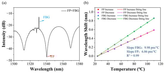 (a) The reflection interference spectrum of the FPI flowmeter connected to an FBG fiber-optic temperature sensor. (b) The linear response of two sensors between wavelength shift and temperature.