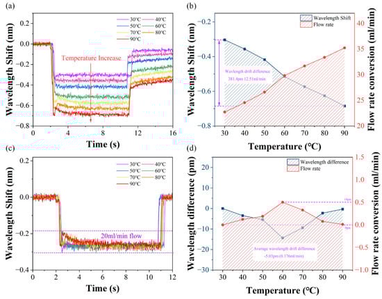 To verify the effectiveness of temperature compensation, a variable temperature flow test can be carried out by fixing a flow pipeline to a heating platform, and then deionized water will fill with the channel by providing the FBG-compensated FPI flowmeter. Figure 8a visualizes the wavelength drift of the FPI flowmeter from stabilizing at a set temperature moment to injecting at a flow rate of 20 mL/min with the syringe pump. As shown in Figure 8b, the wavelength drift difference in the FPI flowmeter is 381.4 pm, which converts to 12.51 mL/min at the same flow rate. This method leads to excessive flow measurement errors. The wavelength shift measured by the FPI flowmeter subtracts the spectral drift caused by temperature, which is measured by the FBG sensor, as demonstrated in Figure 8c.