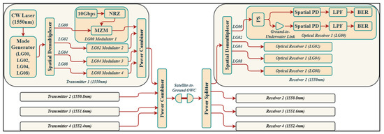 The mode division multiplexing (MDM) method can be utilized to upgrade the capacity of an OWC link that uses spatial light modes as the information carrier. The orbital angular momentum (OAM) mode has been widely used to improve the capacity of OWC links incorporating the spatial orthogonality of distinct OAM modes [4]. Due to its distinguishability as well as orthogonality through distinct limitless charge numbers, OAM acts as an auxiliary degree of freedom in support of de-/multiplexing and for enhancing overall system capacity [5]. To reduce the complexity of digital signal processing in MDM, the satellite–ground–underwater OWC system is utilized. In this case, the complexity is quantified by the equalizers that are used in MDM reception [6].