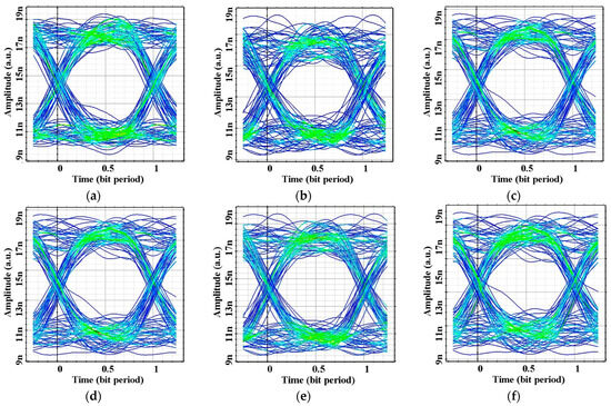 Figure 5a–f depict the eye patterns observed at different OWC link ranges for different LG modes under weak turbulence. It can be seen that, with an increase in link range from 21,000 to 30,000 km, distorted eye patters are observed under the no-turbulence conditions, as shown in Figure 5a,b. By considering weak turbulence, a clear and widely opened eye pattern is observed for LG[0,0] over 25,000 km followed by the eye patterns for the LG[0,2], LG[0,4], and LG[0,8] modes, as depicted in Figure 5c–f.