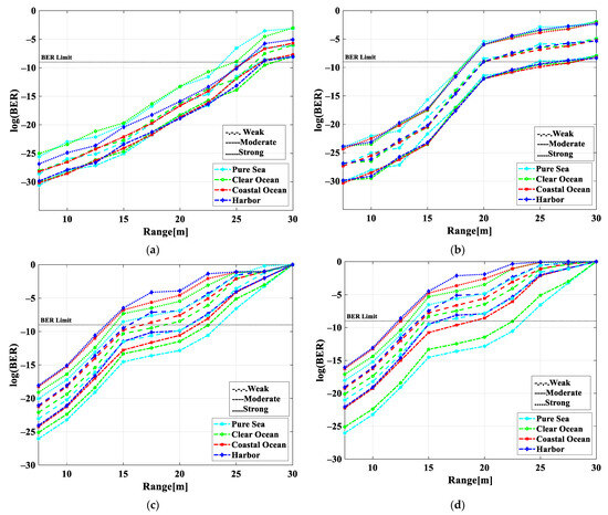 Figure 6a–d show the variation in BER values with the UWOC link range for different turbulences, water types, and operating modes. A maximum transmission range of 50 m is obtained for pure sea with a weak scintillation effect followed by the moderate and then the strong effects. Additionally, clear oceans perform the best, followed by coastal oceans, and harbor waters perform the worst at a log(BER) limit of −9. Moreover, the LG[0,0] mode provides a superior performance in all cases over the other modes. For the LG[0,0] mode, the maximum transmission range is 19–27 m under all scintillation effects and in all types of water, as shown in Figure 6a. Additionally, for the LG[0,2] mode shown in Figure 6b, faithful transmission ranges of 26 m under weak, 20 m under moderate, and 18 m under strong scintillation effects are obtained for all types of water. According to Figure 6c, weak, moderate, and strong scintillation effects offer wireless ranges of 22–24 m, 16–18 m, and 13–15 m, respectively, at LG[0,4]. Figure 6d shows that, for the LG[0,8] mode, the weak, moderate, and strong scintillation effects achieve maximum ranges of 15–23 m, 13–15 m, and 12–14 m, respectively. In Table 4, Table 5 and Table 6, the results of the proposed system for ground-to-underwater communication under weak-to-strong scintillation effects are summarized for the different modes and water types.