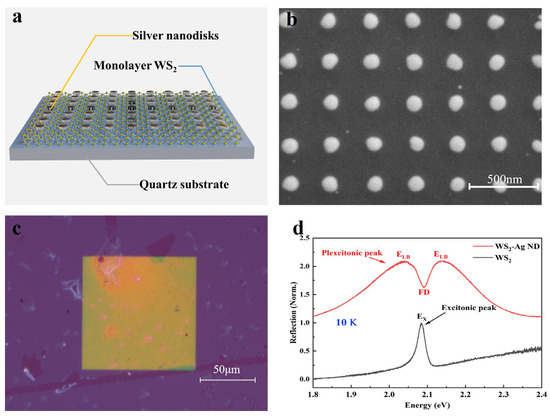 (a) Schematic diagram of the WS2–Ag ND hybrid system. (b) Scanning electron microscope image. (c) Optical microscopy image of the WS2–Ag ND heterostructure sample. (d) The reflectance spectra of monolayer WS2 (black) and the WS2–Ag ND heterostructure (red) at 10K temperature.