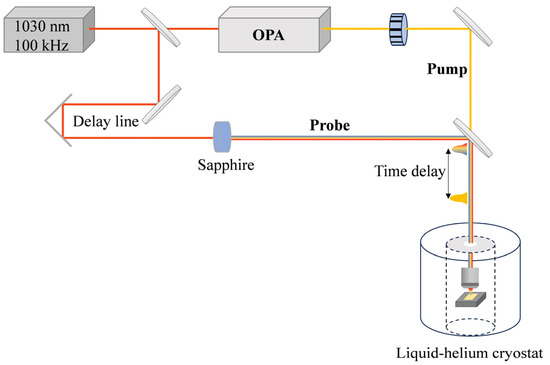 Schematic of the transient differential reflection (TR) measurement setup. The femtosecond light emitted by a Pharos femtosecond laser system (PH2−20W, Light Conversion, 1030 nm, 100 kHz, FWHM of 230 fs, and 20 W) is split into two beams. The stronger beam is directed to an optical parametric amplifier (ORPHEUS-HP, Light Conversion) to produce a wavelength-tunable pump beam with an FWHM of 140 fs. The weaker beam is focused on a high-quality sapphire crystal to generate a supercontinuum white light probe pulse. The cryogenic temperature is maintained by a liquid-helium exchange gas cryostat (attoDRY1000, Attocube systems AG) equipped with a confocal system with a numerical aperture of 0.82.