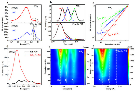Figure 3c extracts the PL intensities of different excitonic complexes (IX, IT, and IXX−) as a function of the pump power P, fitting with the power-law model (I ∝ Pα). The fitting exponents of the X, T are 0.84 and 1.09, respectively, showing sublinear and linear power-dependent emission, indicating their single-particle characteristic. In contrast, the XX− displays a distinctly superlinear behavior, with an α of 1.51, indicating its biexcitonic nature, which possibly arises from neutral biexciton or charged biexciton. The former, however, possesses a binding energy of 20–25 meV [7]; the comparison with neutral exciton, which falls significantly below the observed value of 50 meV here, eliminates the likelihood of its presence. To further study the effect of plasmonics on excitonic emission, Figure 3d compares the PL spectra from both sample regions on a shared coordinate system after removing the trap state PL. Compared with the pure WS2, the three emission peaks in the heterostructure have been enhanced. Importantly, the enhancement of the XX− is ~114.3-fold, which is much higher than those of X (~2.2-fold) and T (~16.4-fold). To the best of our knowledge, such a large PL enhancement of charged biexciton has not been observed in previous studies. Figure 2e,f further show the contour map of the power-dependent intrinsic PL spectra, which show that in the whole pump power range, the PL emission peaks in the heterostructure region are much higher than those in monolayer WS2 region, and the emission peak is always dominated by XX−. In addition, the data fitting in Figure 3c is derived from Figure 3e,f. Throughout the entire range of pump power values, no variation in the linear coefficient α is observed. This absence of change suggests that our sample likely operates within a well-defined linear range, or the inability to test its nonlinearity under high-power working regime may stem from limitations in the testing conditions. The strong field around the plasmon cavity can penetrate the single atom layer thickness of WS2. In principle, the enhancement of the plasmonic nanocavity can be caused by two factors: the enhancement from the excitonic generation, or the promotion of the excitonic emission. In the sample structure, the plasmonic nanocavity is directly attached to a single layer of WS2 without a dielectric layer in the middle. Specifically, in the photo absorption process, the Fano resonance emerging between the plasmonic nanocavity and the monolayer WS2 may lead to the energy transfer from Ag ND to WS2, as the absorption coefficient of the former is much larger than that of the latter. Additionally, during the recombination process, the plasmonic nanocavity may also enhance the radiative recombination process. As a result, the photoluminescence of the excitonic complexes undergoes significant enhancement.