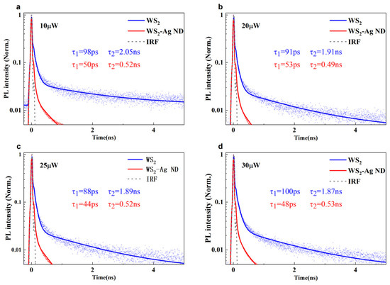 In order to better understand why the charged biexciton produces such a giant PL enhancement in the heterostructure region, time-resolved PL of WS2 and WS2–Ag ND samples were investigated by using the time-correlated single photon counting (TCSPC) technique under 560 nm excitation, and the probe wavelength was focused at the XX− resonance. As shown in Figure 4, the time-resolved PL can be fitted by double exponential decay: