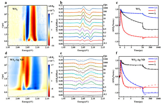 Due to the limited time resolution of TCSPC, the effect of the plasmonic coupling on the exciton emission cannot be better analyzed. To further understand the formation and relaxation processes of charged biexciton induced by plasmons, the transient differential reflectance spectra were measured by femtosecond-pulsed laser pumping at 560 nm at 4K. To avoid the nonlinear effects induced by the high carrier density, a pump fluence of 10 μJ cm−2 was selected. Figure 5a,d show the pseudo-color diagram of the transient differential reflection spectra (∆R) of controlled WS2 and the heterostructure. For WS2, three well-separated photoinduced bleaching (PB, red area) signals are clearly found, located at the X, T, and XX− resonances in the first 1 ps; these are attributed to their state-filling effects [28]. In the heterostructure region, the three bleaching signals all convert to three photoinduced absorption (PA, blue area) peaks in an early time delay of <1 ps, which is the hallmark of the saturation nonlinear effects of the excitons, in which the Pauli blocking of the pump injecting exciton reduces the coupling strength between the excitons and plasmon [20,29]. In Figure 5b,e, the transient differential reflection spectra at selected probe delays showcase three clearly separated peaks and their temporal progression. The clearly separated peak signals detected under femtosecond pumping suggest that our fabricated sample is highly conducive to investigating the interplay between multibody exciton states and nanocavity in TMDs materials. We can distinctly observe the temporal evolution of the three excitonic states in the sample from the time-resolved spectrum. To obtain more detailed information about the relaxation process, the differential reflection spectrum signals of the three PB peaks in WS2 and the three PA peaks in the heterostructure region are dynamically fitted using the multi-exponential function outlined in Formula (2):