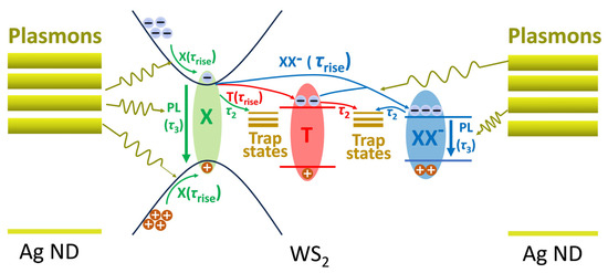 Schematic diagram of the plasmonic effect on the exciton, trion, and charged biexciton dynamics in the WS2–Ag ND heterostructure. The three colored arrows (green, red, and blue) represent the of exciton, trion and charged biexciton, respectively, including both the formation (τrise) and the recombination (τ2 and τ3) processes, where τ2 denotes the trap-assisted recombination process, and τ3 represents the radiation recombination process. The greenish yellow arrow represents the plasmons-enhancement process.