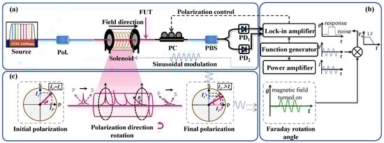 where θ0 is the Faraday rotation angle, ωs is the modulated signal frequency, and φ0 is the initial phase. It can be seen from the formula that compared with the rotating polarization method (based on two cross polarizers) [22], the balanced polarization method has the advantage of eliminating the influence of light source intensity fluctuation on the measurement results and improving the accuracy of the measurement results.