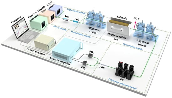 The measurement module comprises two pairs of six-degree-of-freedom alignment systems, the samples under test, and a magnetic field generation device. We fixed the gradient index lens on the alignment system and used the alignment system to complete the coupling of spatial light. We use a solenoid as a magnetic-field-generation device. In the driver module, the function generator generated two signals. One was input to a power amplifier (YingPu Magnetoelectric, HEAS-20, Changchun, China) as a modulation signal driving the solenoid. The other was fed into a lock-in amplifier (Zurich Instruments, UHFLI-600, Zurich, Switzerland) as a reference signal for the demodulation.