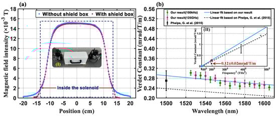 (a) Comparison of magnetic field distribution results with or without shielding box based on Gauss meter. (b) Measurement results of Verdet constant of air and comparison with other results [24]. (I) Practical experimental device for measuring Verdet constant of air based on a gradient index lens. (II) Linear fitting result of air Verdet constant corresponds to the square of the optical frequency v.