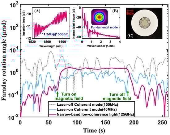 We compared the Faraday effect strength of ARF at 1550 nm under three different light source schemes with linewidths of 100 kHz, 40 MHz, and 125 GHz, respectively. The laser source (Santec TSL-570) output a 100 kHz linewidth light when the coherence control was turned off and a 40 MHz linewidth light when the coherence control was turned on. The narrow-band low-coherence light source output a 125 GHz linewidth light when the bandwidth of the tunable filter was set to 1 nm. The polarization balance state was measured for 60 s in each light source scheme. Then, we set the power amplifier drive current to 1.70 A and turned on the magnetic field. In this process, the demodulation results correspond to the Faraday rotation angle. We maintained the magnetic field loading time for 100 s, and then, turned off the magnetic field and measured again for 60 s at the polarization balance state. The measurement results for the three light source schemes are shown in Figure 4. The results show that the Faraday rotation angle of ARF is only about 1.4 μrad at a 1.70 A driven current, and only the narrow-band low-coherence light scheme can effectively suppress the intermodal interference noise and respond to the Verdet constant measurement of ARF.