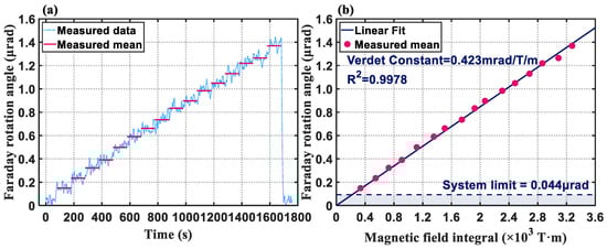 (a) The measurement results of the Faraday rotation angle of ARF at 1550 nm based on a wide−spectrum light source and tunable filter (Faraday rotation angle increases with time). (b) The relationship between the measured mean value of the Faraday rotation angle of ARF and the integral of the magnetic field intensity of the solenoid. The slope of the fitted curve is the Verdet constant of ARF.